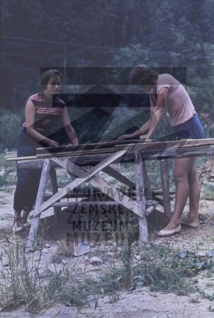 Přesívání sedimentů před jižním vchodem do jeskyně Kůlny. Na snímku A. Gebauerová a M. Kalová. Diapozitiv 1963