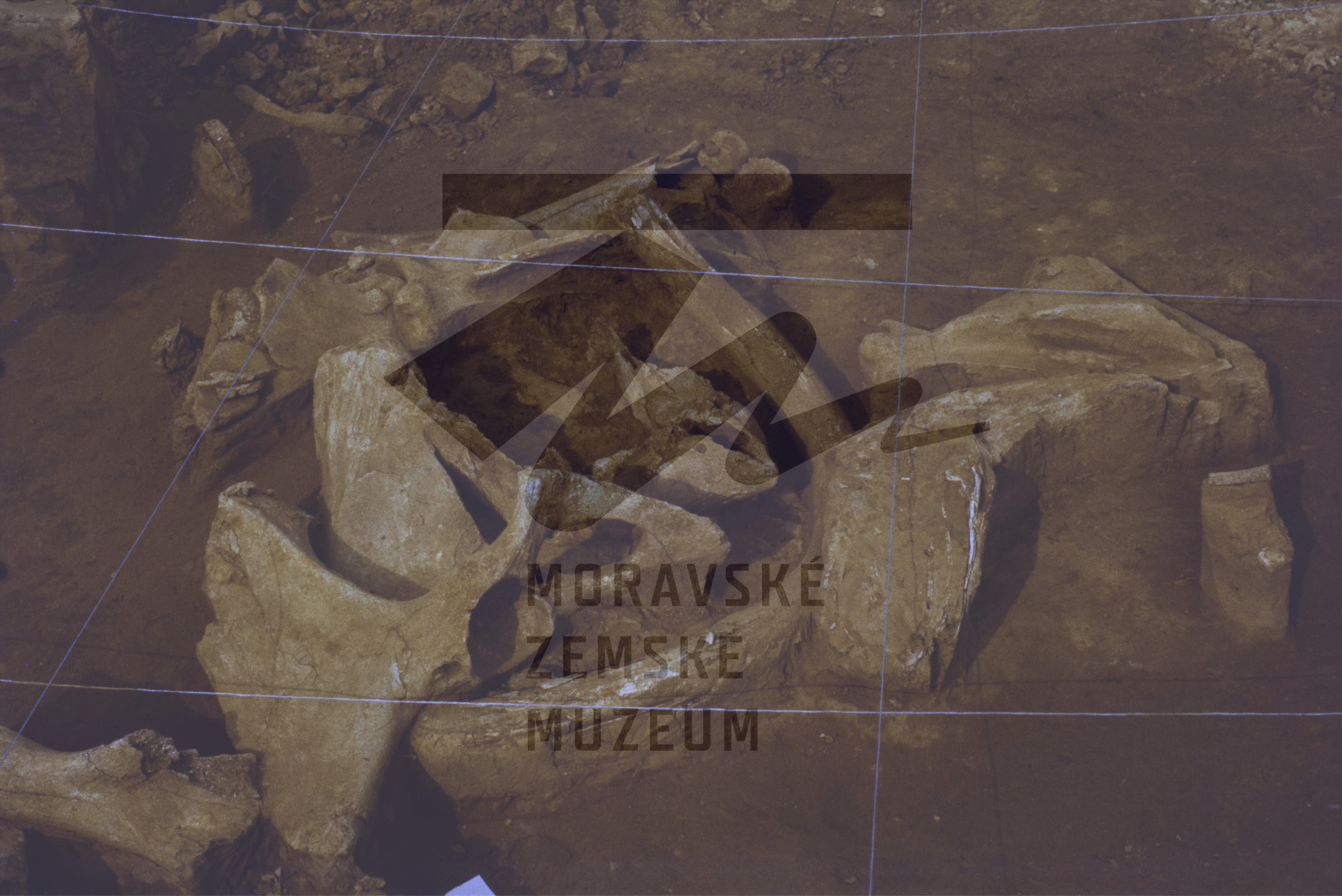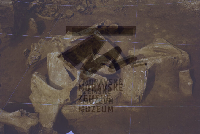 Akumulace mamutích kostí v gravettienské vrstvě.