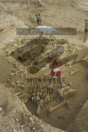 Akumulace mamutích kostí v gravettienské vrstvě.