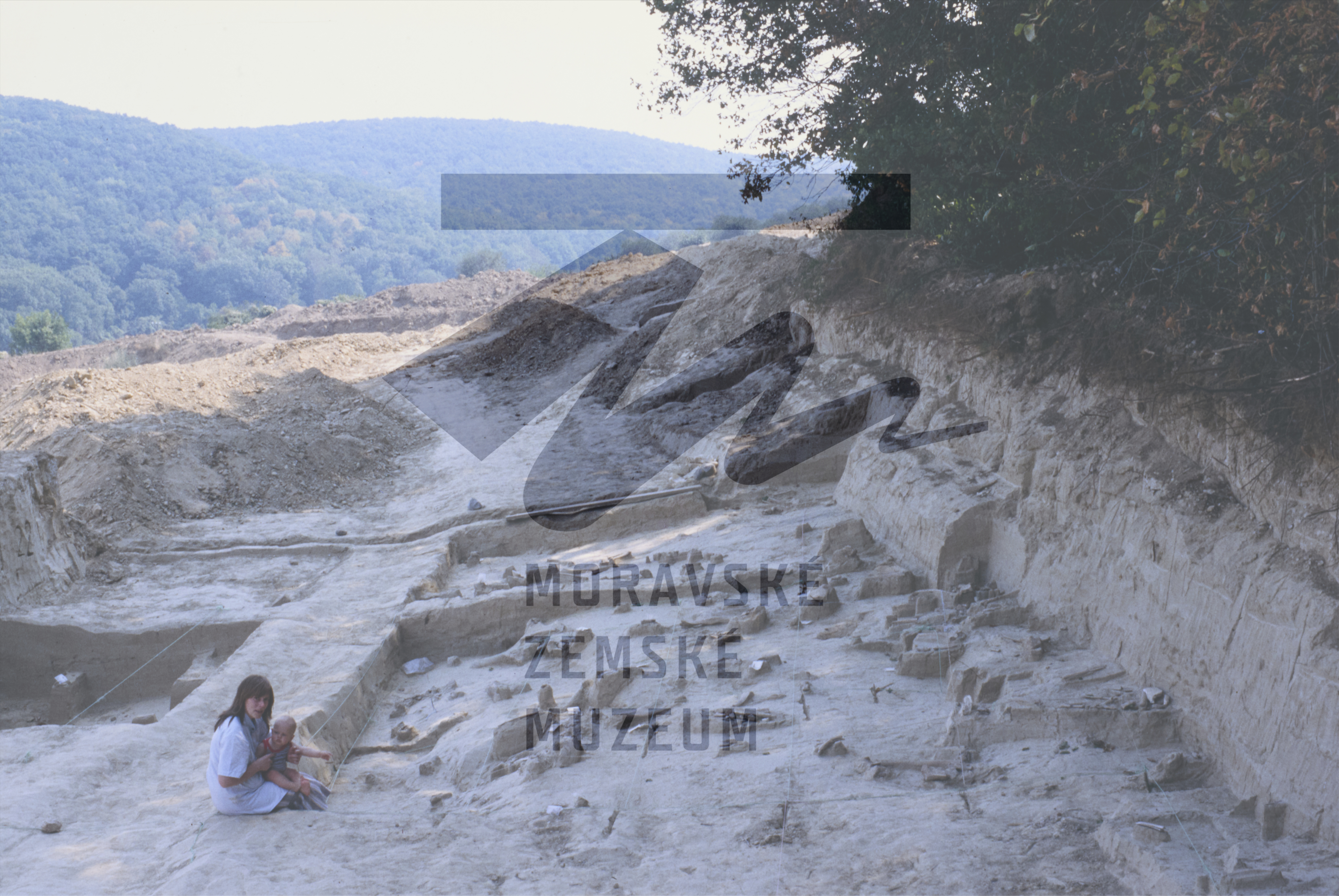 Výzkum gravettienské vrstvy v nejvyšší části lokality na hranici lesa. Rozptýlené mamutí kosti.