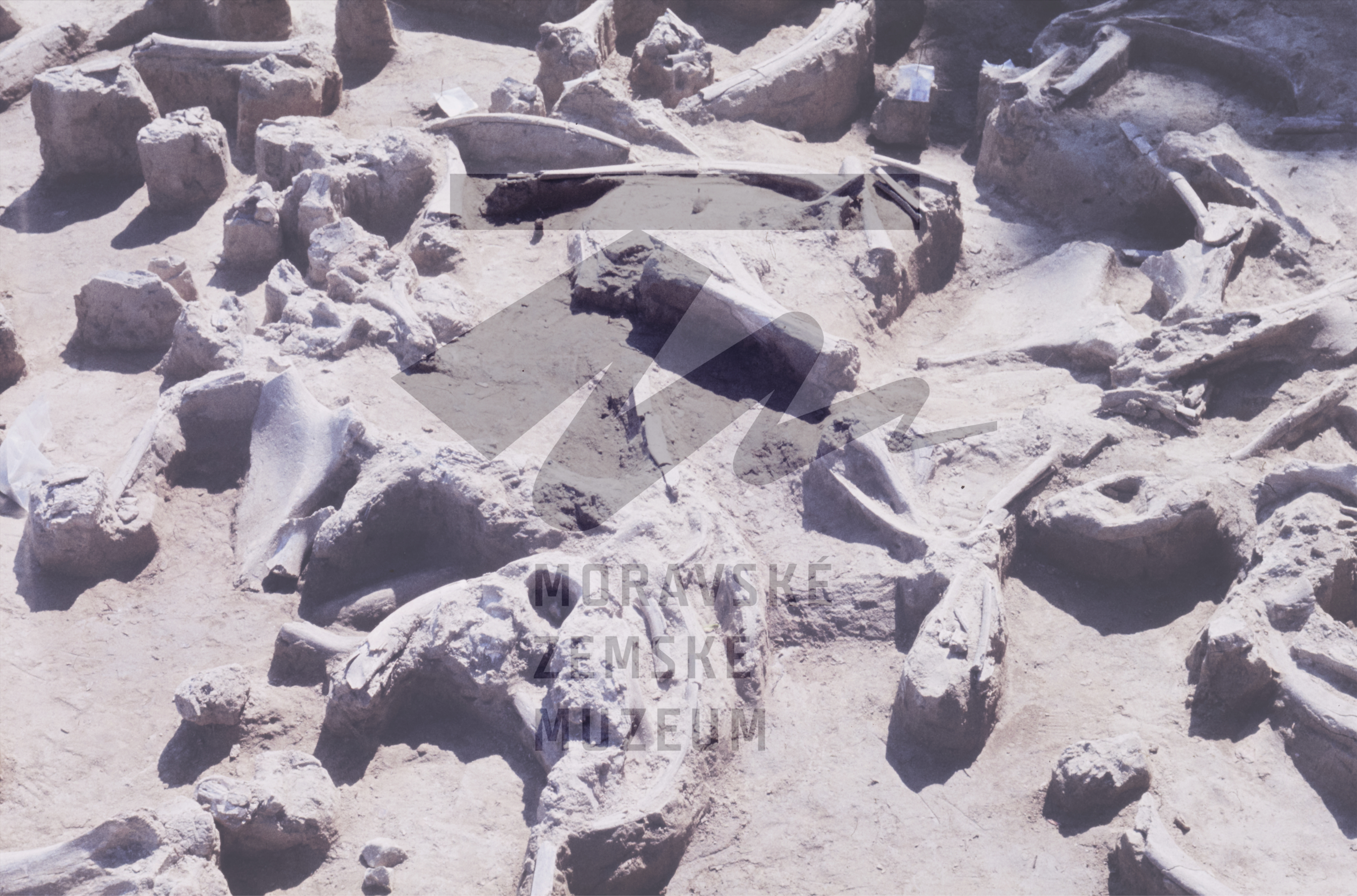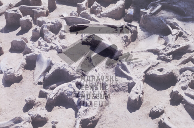 Akumulace mamutích kostí v gravettienské vrstvě.