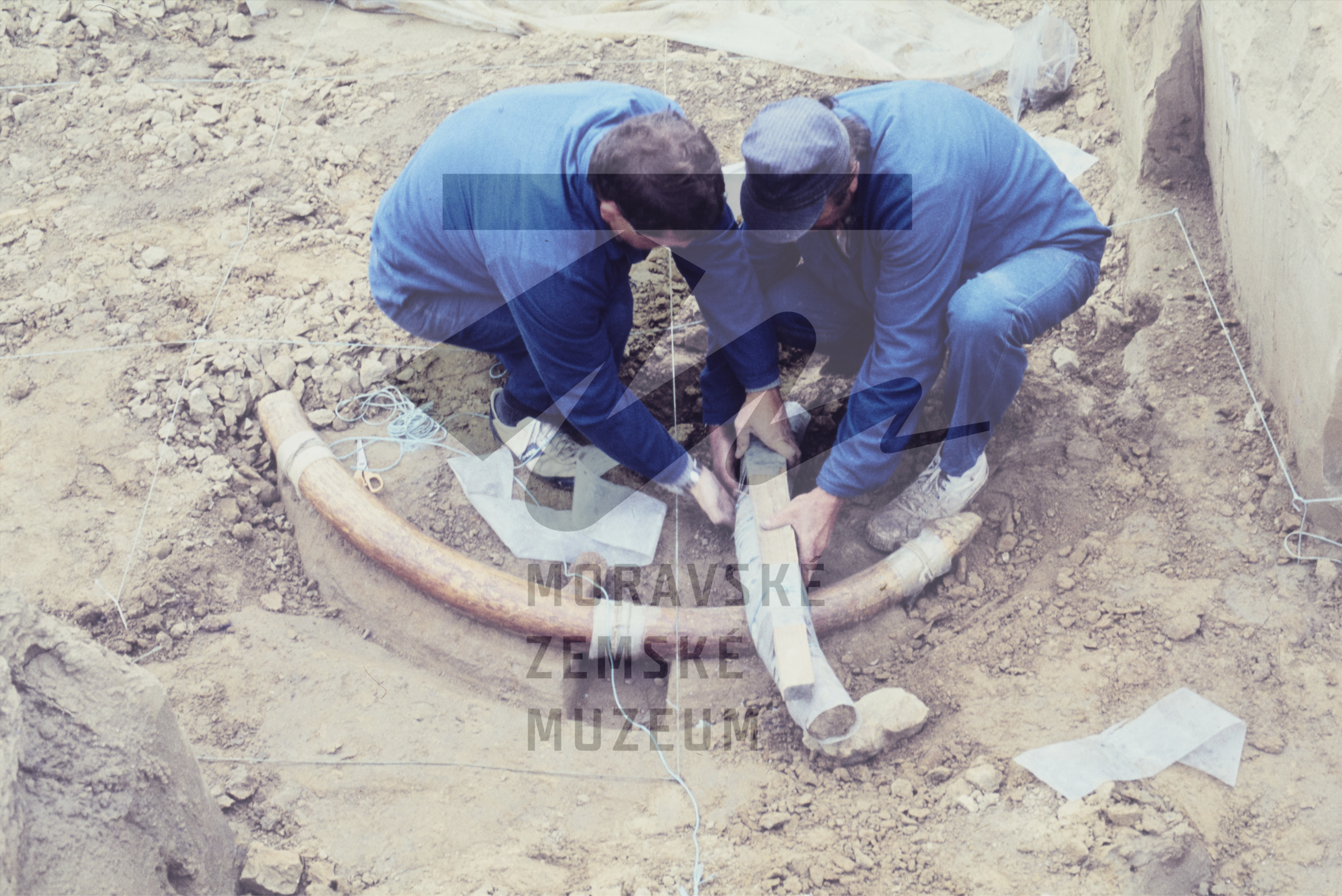 Vyzvedávání mamutích klů z gravettienské kulturní vrstvy.