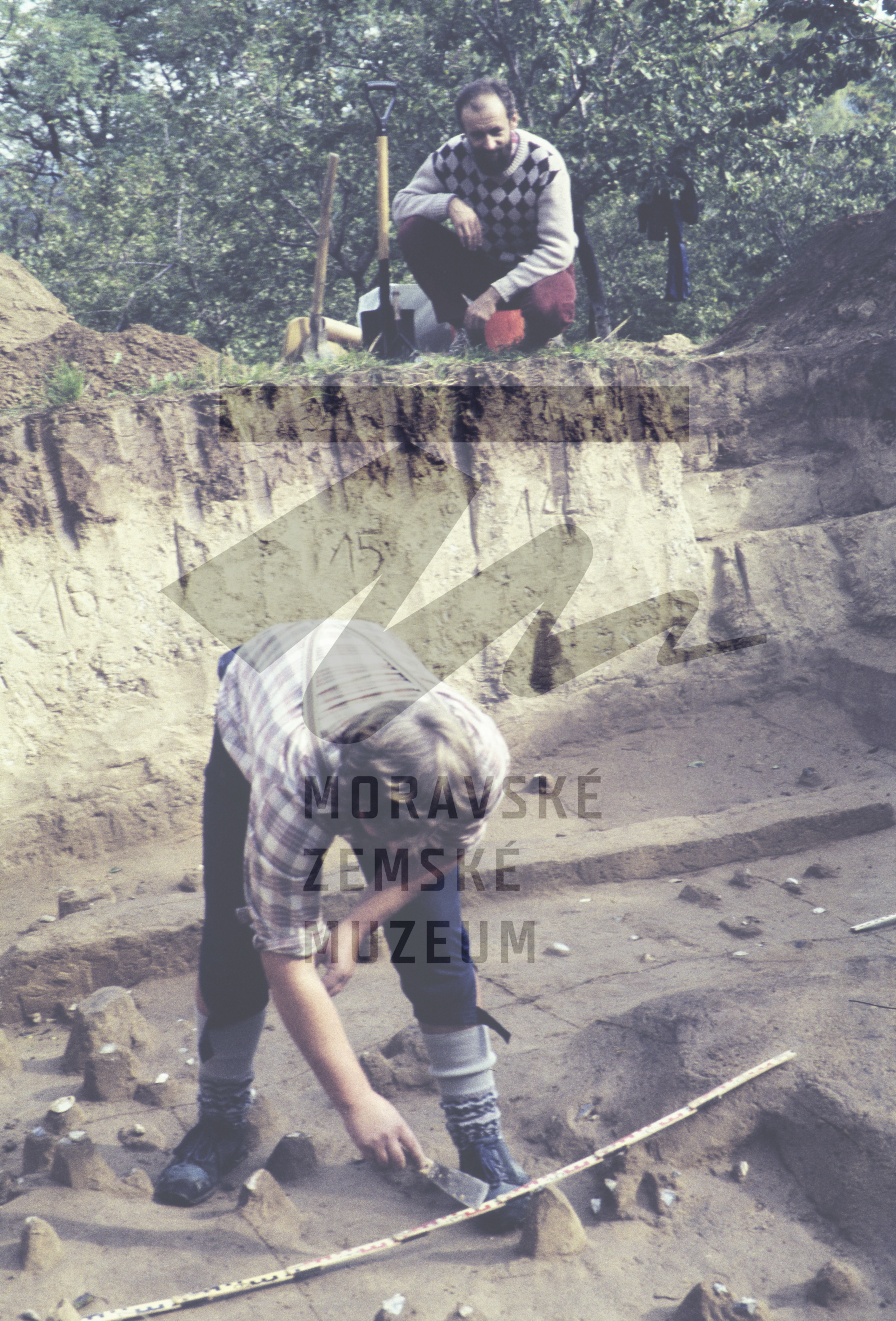 Preparace kulturní vrstvy szeletienu. Vpředu L. Seitl, na profilu O. Kroupa.