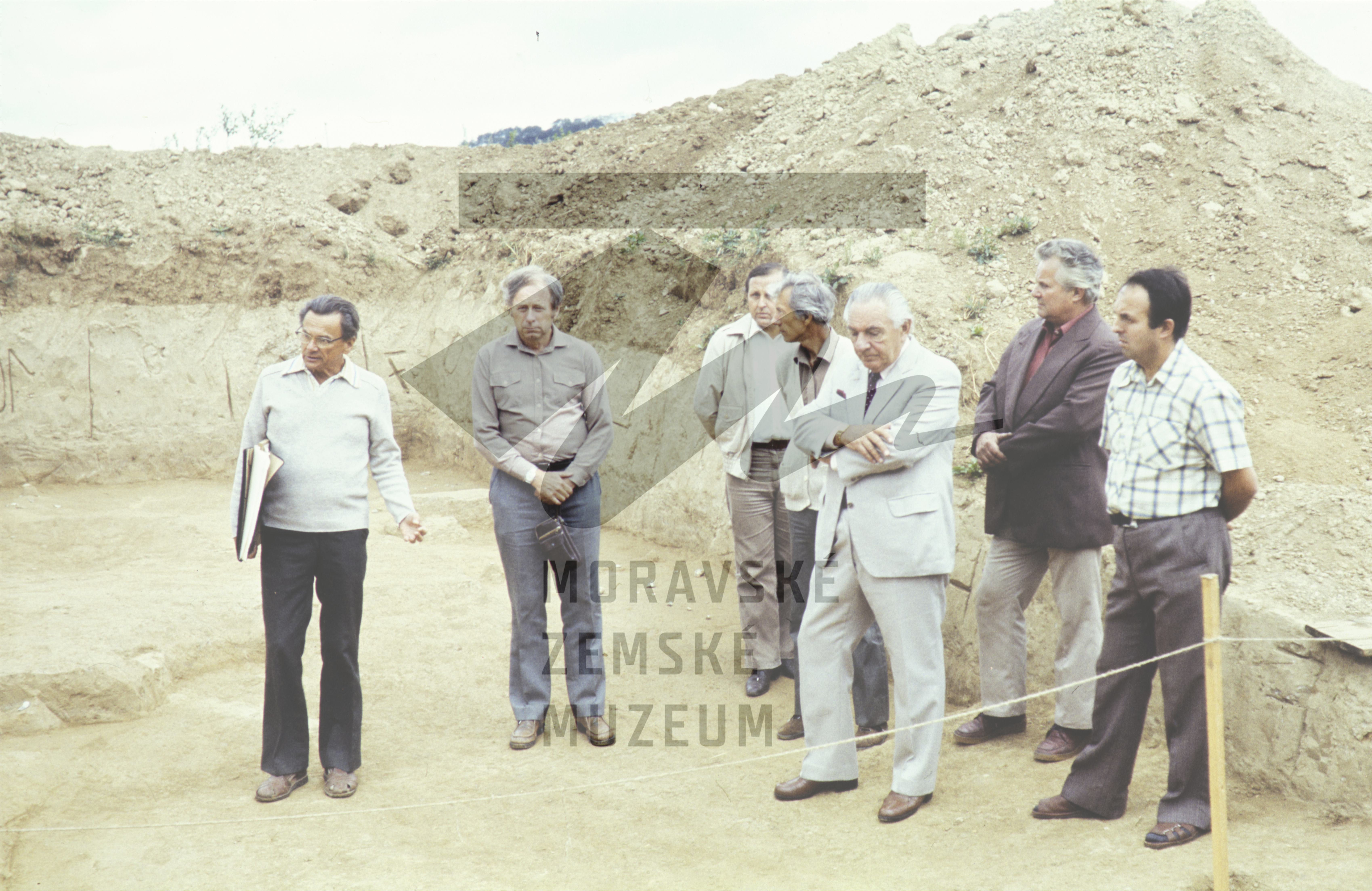 Komise na výzkumu. Zleva K. Valoch, K. Sklenář, J. Kovárník, Ondruš, J. Poulík.