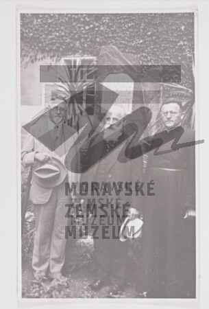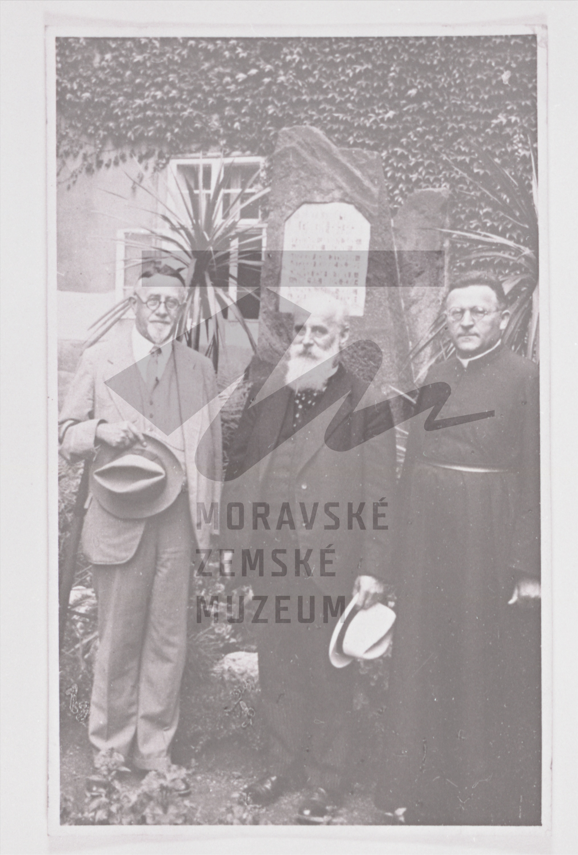 Erich Tschermak von Seysenegg (1871-1962), Ernest Laur (1871-1964) a Anselm Matoušek (1881-1939) před pomníčkem, 1936.